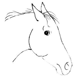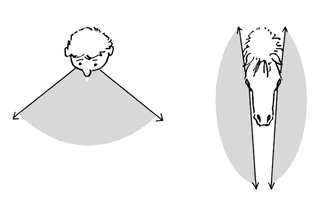 Paarden hebben ogen aan de zijkant. Op deze manier kunnen ze bijna helemaal rondom zien. Maar niet helemaal. Voor zich kunnen ze niets zien en recht achter hun ook niet. Bovenstaand plaatje laat zien waar de blinde vlek is van een paard. Alles wat gestreept is kan een paard dus niet zien. Daarvoor moet hij zijn hoofd draaien. Nu weet je waarom je een paard niet van achteren mag naderen. Hij ziet je gewoonweg niet.